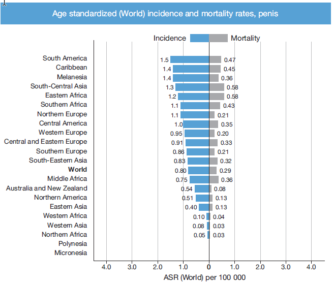 Tabla 1. Incidencia de cáncer de pene y mortalidad en el mundo estandarizado por edad (por 100.000 hab. (2)
