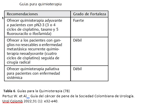 Tabla 6. Resumen de recomendaciones al uso de quimioterapia en cáncer de pene (80).
