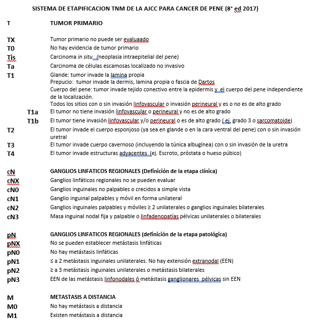 Respecto de la etapificación patológica (etapificación quirúrgica) para cáncer de pene de la AJCC de enero 2017, se presenta la agrupación por etapas. Es la más reciente. Sirve sobre todo para el carcinoma escamoso que lejos es el más frecuente.