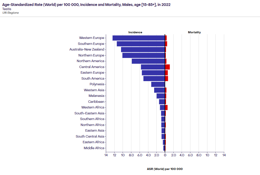 El cáncer de testículo representa el 1 – 1.5 % de las neoplasias masculinas, y el 5% de los tumores urológicos del hombre. Sin embargo, su importancia radica en que es el tumor sólido más frecuente de adolescentes y hombres jóvenes entre 15-40 años, con más de 70.000 nuevos casos diagnosticados cada año. La edad promedio de presentación es 33 años y 8% de los pacientes tienen más de 55 años al momento del diagnóstico. Su incidencia a nivel mundial, reportada como “tasa estandarizada por edad” o ASR, por sus siglas en inglés, ha aumentado en las últimas 4 décadas en la mayoría de los países industrializados, con diferencias sorprendentes en las ASR, incluso entre países vecinos, siendo actualmente de 0.4‑12.5 por 100.000 hombres/año, con las tasas más altas en Europa, Oceanía y América del Norte (Fig.1). La mortalidad de la enfermedad es baja, principalmente por el uso de esquemas de quimioterapia (QMT) basados en cisplatino, en uso desde inicios de 1970, con tasas de 0.1-1.2 por 100.000 hombres/año, con las tasas más altas en América Central (Fig.1) (1,2)