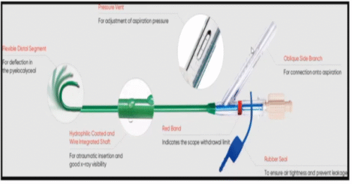 | ClearPetra® | 11/13 – 12/14 Fr | 28–46 cm | Canal central con succión activa | Manual o bomba externa | Ureteroscopios flexibles estándar | Alta eficiencia en evacuación de fragmentos |