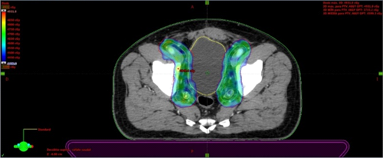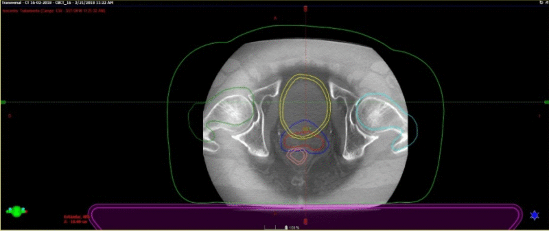 Fig. 2. Técnica de IMRT (Radioterapia de intensidad modulada). Se observa como la conformación de la dosis terapéutica protege de manera segura los órganos de riesgo (OARS). La zona de color, muestra la dosis de radiación terapéutica (46Gy) sobre las regiones ganglionares a nivel ilíaco interno, externo y obturatriz. Se evidencia así que las dosis llegan exclusivamente a la zona de interés, respetando la vejiga y el recto.