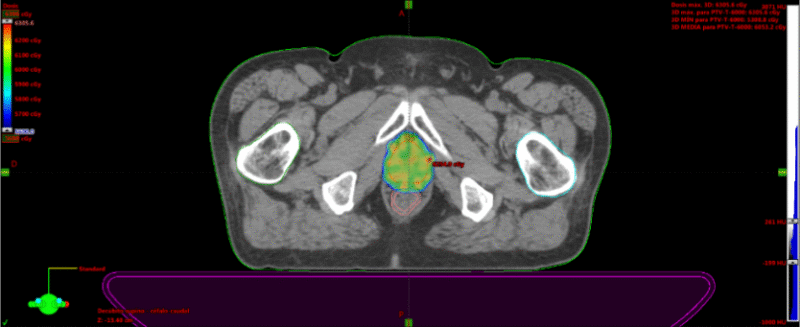 Fig. 2b. Técnica de IMRT (Radioterapia de intensidad modulada). La zona de color, muestra la dosis de radiación terapéutica (70Gy) sobre la próstata. Se evidencia que la dosis alta sólo llega sobre el target, respetando hacia posterior el recto.