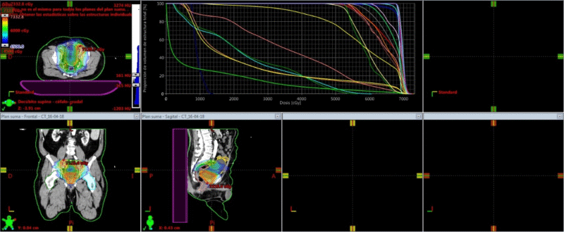 Fig. 2c. Técnica de IMRT (Radioterapia de intensidad modulada). Se observa en los colores las dosis de radiación sobre la pelvis (verde y azul, 46Gy) y sobre la próstata (naranjo, 70Gy). En el gráfico, las líneas de colores corresponden a los órganos de riesgo (OAR) y los target, en donde se mide la dosis de radiación, en un volumen determinado que llega al OAR, para así saber que está en rangos de buena tolerancia (ya predeterminados) y que las zonas target reciban al menos las dosis mínimas terapéuticas. Las dosis están en cGy (70Gy= 7000cGy).