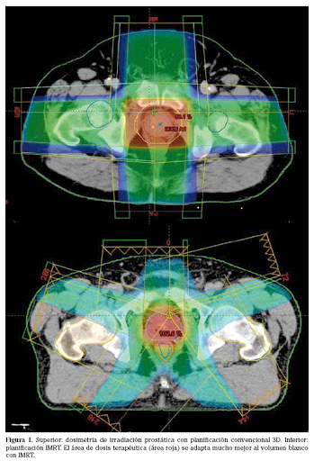 La radioterapia en el contexto de un tratamiento definitivo ha demostrado ser útil en pacientes de riesgo bajo, intermedio y alto, con ciertas diferencias de tratamiento en cada una de ellas. El esquema convencional, entrega dosis de 74-78Gy a 1,8-2Gy por fracción sobre a próstata y vesículas seminales. (8-9) y a linfonodos pélvicos entrega dosis de entre los 45-50Gy. En caso de confirmar compromiso ganglionar evidente, se puede escalar hasta 60-66Gy con IMRT sobre las adenopatías comprometidas.
