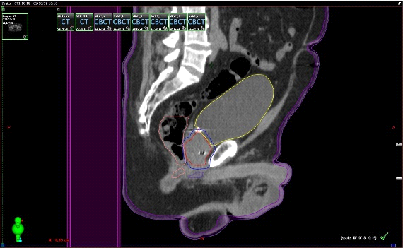 Fig. 8. Paciente en tratamiento. Esta imagen corresponde el conbeamCT que se realiza en cada sesión de tratamiento y se superpone con el TAC previo de simulación que tiene los contornos. El contorno azul fue realizado previamente en el TAC de simulación. Así sabemos que la dosis llegará sólo sobre ese sector.