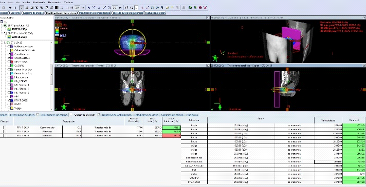Fig. 7. Dosimetría con aprobación de parámetros de dosis en Target y órganos de riesgo. Las barras verdes, evidencian que el plan de Radioterapia estereotáxica está cumpliendo con los parámetros de seguridad sobre los órganos de riesgo con la dosis adecuado sobre la próstata. Cuando aparecen barras rojas, se pasa a un segundo nivel de seguridad, en donde las dosis del target aseguran la mínima posibilidad de toxicidad sobre los OAR.
