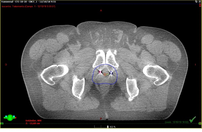 Fig. 6. Tac con fiduciales y contornos. Dosimetría: 36.25Gy en 5 Sesiones, Días alternos. Los fiduciales son los puntos blancos dentro de la próstata semilla que se implantan previamente para tener un punto de referencia local confiables al realizar imágenes diaras previo al inicio de cada sesión.