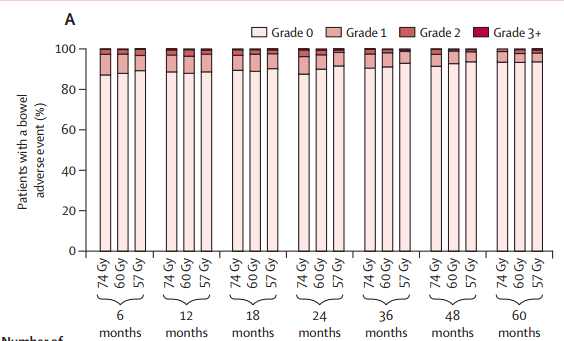 Dentro de este contexto el fraccionamiento más utilizado es el fraccionamiento convencional con dosis de 60 a 70 Gy, con dosis de 1,8 a 2 Gy por fracción. Aunque en los últimos años han ido ganando terreno los fraccionamientos hipofraccionados moderados y extremos, ya que al comparar las toxicidades aguas y crónicas en los distintos esquemas de radioterapia, vemos que no hay diferencias significativas, sin embargo, en los grupos con dosis ≥ 3 Gy, existe mayor porcentaje de toxicidad aguda (3-4 meses) y luego las curvas se tienden a igualar, sin diferencias significativas de toxicidad a largo plazo (Figura 5). (16,17), por lo que se acepta que estos esquemas de tratamiento tienen la misma progresión libre de enfermedad que fraccionamiento convencional, aunque con un leve mayor riesgo de toxicidad (18,19).