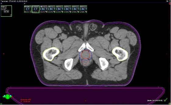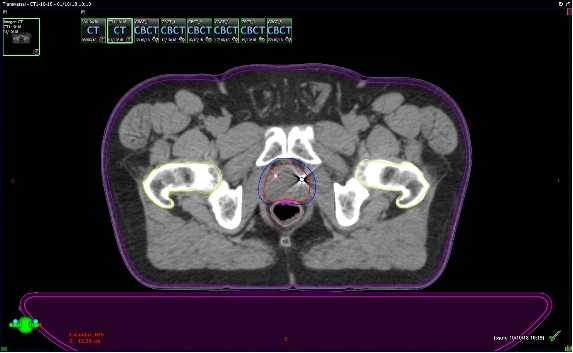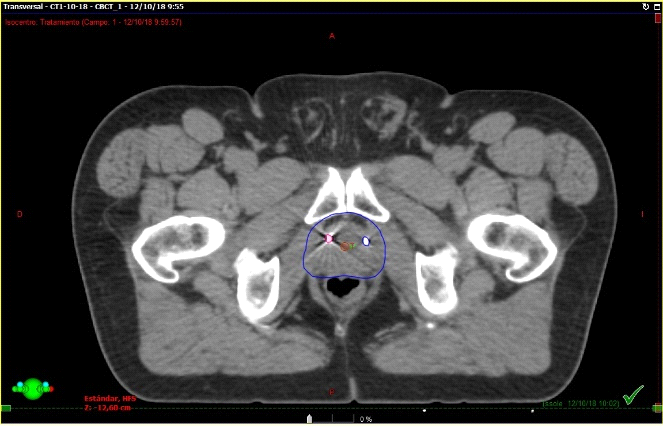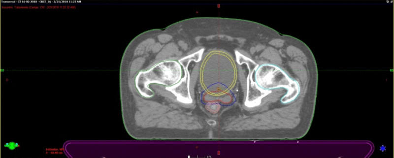 Fig. 8. Paciente en tratamiento. Esta imagen corresponde el conbeamCT que se realiza en cada sesión de tratamiento y se superpone con el TAC previo de simulación que tiene los contornos. El contorno azul fue realizado previamente en el TAC de simulación. Así sabemos que la dosis llegará sólo sobre ese sector.